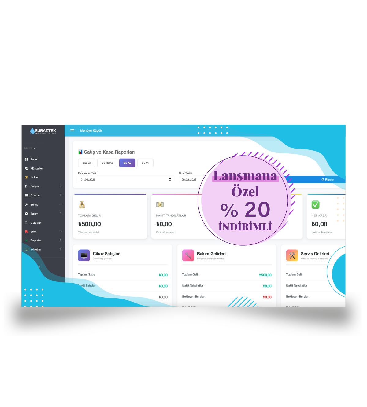 Su arıtma firmaları için online lisanslı servis takip yazılımı. Lansmana özel %20 indirimli fiyatıyla sizleri bekliyor. İndirimi kaçırmayın.